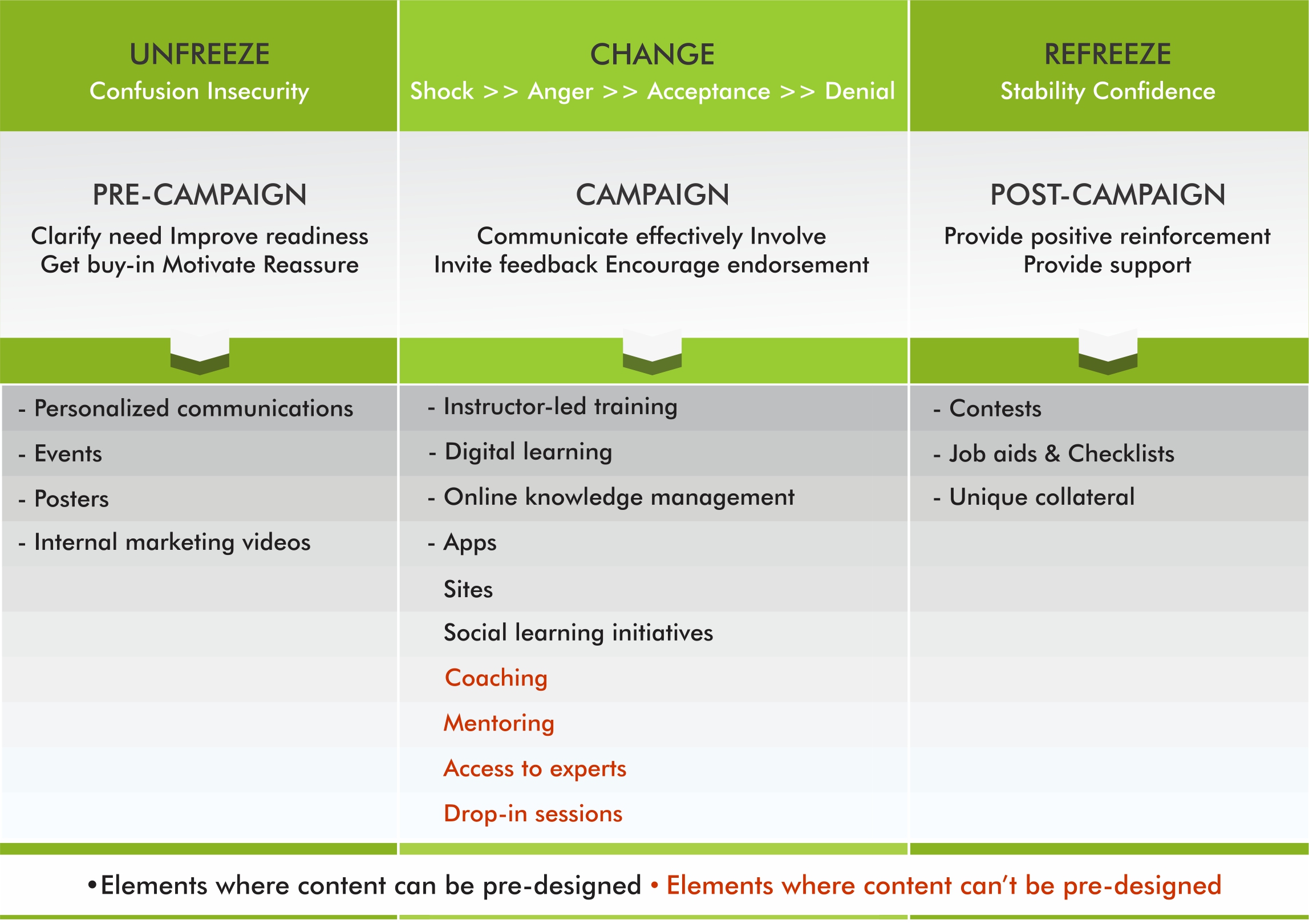 The graphic presented here identifies the feelings associated with each phase of Change Management, and attempts to link it with derived objectives from the viewpoint of a campaign. It then goes on to explore some possible learning components that best support the achievement of these objectives.