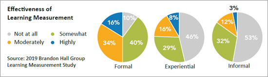 When it comes to measuring formal learning programs, the 2019 Learning Measurement Study by Brandon Hall Group found that 50% of the organizations mention they are fairly effective at it. The relatively lower proportion of organizations claiming lesser measurement effectiveness of informal (15%) and experiential (24%) learning programs is worth noting.